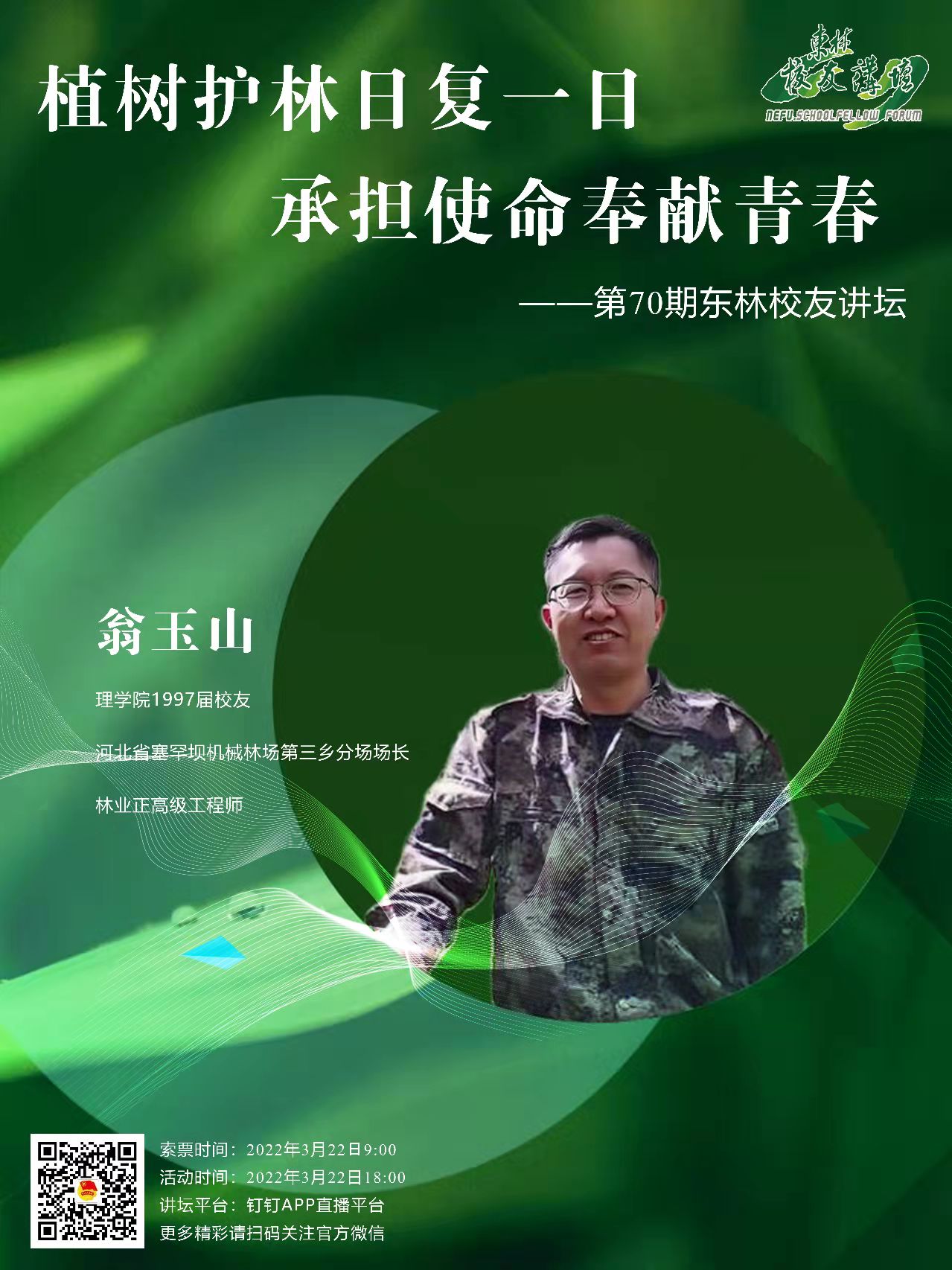 届时,翁玉山校友将结合自身扎根基层林业的工作经历,讲述他多年在塞罕坝机械林场植树造林的心路历程和收获感悟。欢迎广大师生参加!