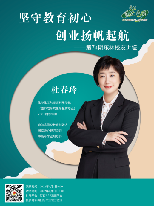 杜春玲校友将结合自身的工作创业经历,分享她在多年教育工作中的心得体会、收获和感悟。