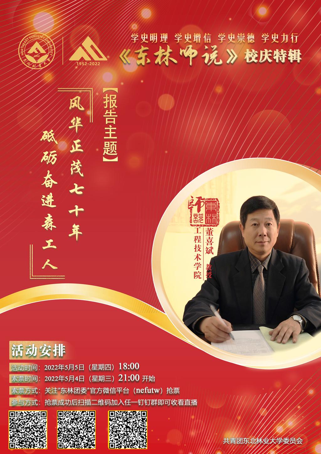 董喜斌教授将结合自身工作学习经历,分享在学校70年发展历程中,工程技术学院筚路蓝缕、砥砺奋进的光辉历史,向广大师生校友讲述工程技术学院创立以来的艰苦创业、自强行远的故事,介绍森工系老一辈创业者、建设者的突出贡献,介绍新时代工程技术学院的办学成就,阐述在新一轮一流学科建设的背景下,工程技术学院的发展规划和目标,引领广大青年师生为学校跨越式发展贡献“东林森工”的智慧和力量!