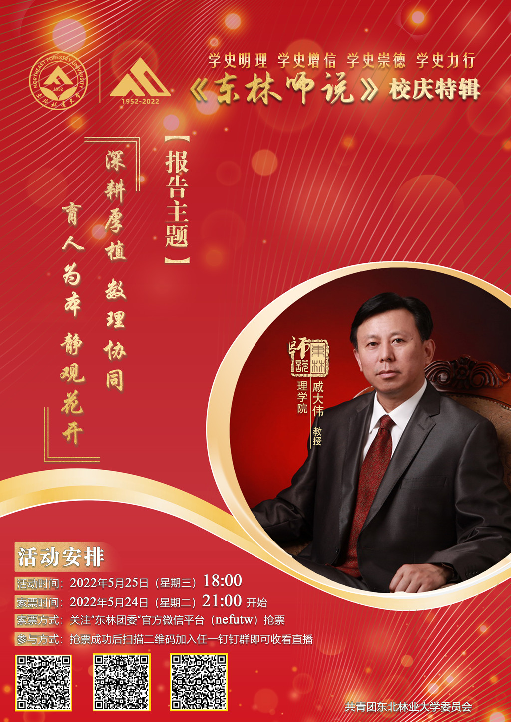 索票方式:关注“东林团委”官方微信平台(nefutw),点击相应推送底部“阅读原文”或发送文字“东林师说”获取抢票链接,输入姓名、班级(单位)、学号(教工号)即可抢票。