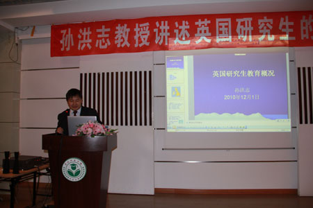 整场讲座以一段唯美的英国苏格兰影像开场。随后孙教授以在英国工作生活中的所见所闻切入主题向广大同学详解了英国研究生教育概况。整个讲座分为五个部分:一、介绍英国的概况;二、英国的教育情况,主要对英国教育简史、学制、义务教育情况、高等学府及其教育情况作了详细的说明。并主要介绍了牛津大学与剑桥大学,使同学们对理想中的学府有了详实的了解;三、针对广大同学对于出国留学的理解误区,孙教授介绍了英国研究生的教育情况,明确了研究生授课式课程与研究式课程的根本区别,为今后意欲申请出国留学的同学提供了基本信息;四、中国学生留学英国的简史、现状及受教育情况,他指出目前中国留学生在英国均接受着较好的硕博教育;五、孙教授就同学最关心的问题——“如何全面规划出国留学”提出了自己的见解,孙教授认为要明确目标、做好留学准备、选择好留学的途径,切忌盲目跟从。