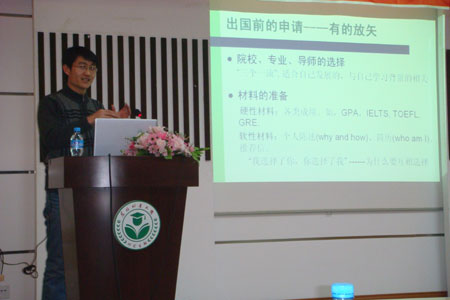 张志军博士为大家讲解了申请美国留学所应具备的条件。首先在硬件条件上必须通过语言考试,如GRE、GPA等等;其次在软件条件上要认真准备个人陈述,让校方充分感受自己的个人魅力。在学习中要勤于动手,敢于表达自己的想法,在英文方面要多看、多写、多说,不断锻炼自己。他的介绍让同学们对申请留学有了更加直观的了解。