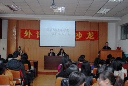 首先,郭永刚副院长致开讲词。王丹院长代表学院向我省科技界知名学者、巾帼女杰奖获得者胡家英教授表示热烈的欢迎。胡教授作了题目为《语言学研究方法中的定性研究方法》的讲座。她从定性研究法的原则、进行定性研究的程序及定性研究和描写性研究的区别三方面谈了自己独到的见解。讲座结束后,与会的领导和教师们就相关学术问题与胡教授进行了面对面的探讨和交流。会场气氛十分热烈。大家近距离地聆听专家学者的教诲,对学术研究进行了回顾与展望,感觉受益匪浅。