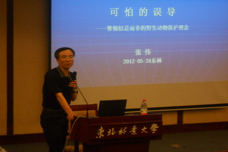 2012年5月24日晚6:30,国家林业局野生动植物检测中心主任、野生动物资源学院党委书记张伟教授应大学生野生生物科研爱好者协会的邀请,在动资楼331国际会议厅为同学们做了一场以“可怕的误导——警惕似是而非的野生动物保护理念”为主题的精彩讲座。野生动物资源学院师生、校内各社团成员代表以及对野生动物保护感兴趣的同学200余人参加了本次讲座。