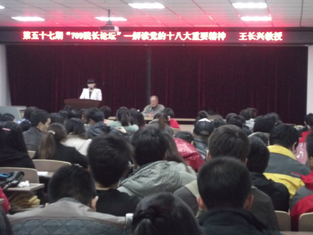 讲座过程中,王老师对十八大的精神作了深刻的总结。“坚定不移沿着中国特色社会主义道路前进,全面为建成小康社会而奋斗”是十八大的主题,同时他认为十八大报告可以归纳为四个部分:一是回忆过去,即对过去五年的工作和十年的基本总结;二是理论创新,坚定不移走中国特色社会主义道路;三是明确目标,即全面建成小康社会和全面深化改革开放;四是九大建设,包括经济、政治、文化、社会、生态文明、国防与军队、一国两制与和平统一、外交、党建,其中生态文明建设是一大亮点,而党的建设则是重中之重。