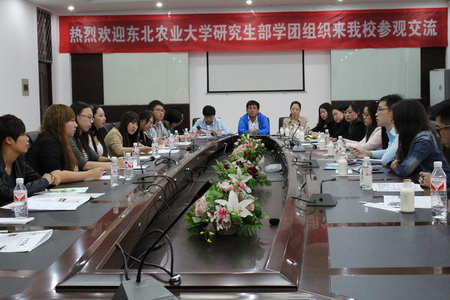 2013年9月27日东北农业大学校研究生学团组织负责人王勇、付婧一老师一行12人到我校研究生院参观交流,我校研究生会负责人张起志老师在研究生院714会议室接待了来访客人。出席交流会的还有我校研究生院团委﹑研究生会﹑科技创新中心﹑寝室管理委员会等主要部门的负责人。