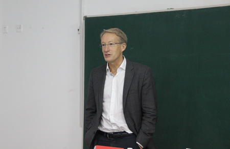 Andrew Skidmore教授的报告题目是《The 25 big questions in Science》,他以Malthus 问题作为重点,结合多个案例分析了环境污染、能源开发、外侵物种以及生物多样性丰富度等领域的主要科学问题,并进一步阐述了遥感技术和GIS在国际应用领域中的前沿、主流方向和重要性。报告中大量的案例和缜密的研究方法极大开阔了同学们的视野,拓宽了研究思路。在讲到光的地理信息遥感技术在环境污染方面的应用时,Andrew Skidmore教授提到了日前备受关注的我国北京地区雾霾严重问题,随后教授话锋一转,说道“But Harbin is good!”,以此表达对冰城哈尔滨的喜爱之情,引得全场一片欢笑。