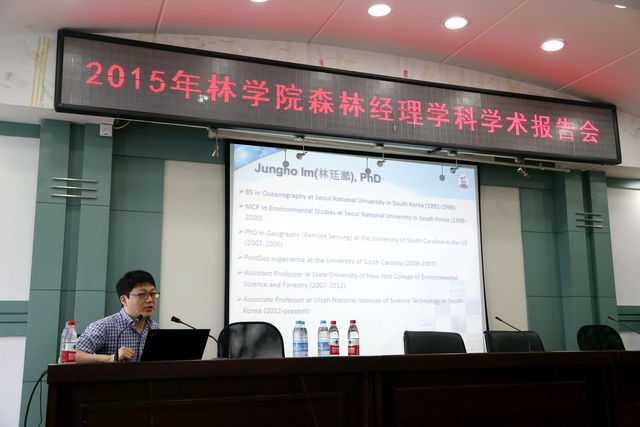 2015年7月8日上午,由安博网页版,安博(中国)官方在线登录林学院森林经理学科举办的学术报告会在主西515学术报告室成功举行。来自韩国蔚山国家科学技术研究所的Jungho Im教授以“遥感技术在林业的应用:树冠提取及林分高度估测”(Remote Sensing Applications over Forest: Tree Crown Delineation and Stand Height Estimation)为主题,呈现了一场别开生面的英文学术报告。会议由森林经理学科甄贞讲师主持,主要参加人员为森林经理学科以及部分哈尔滨师范大学师生。
