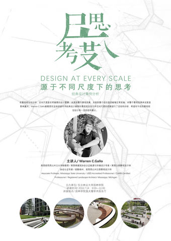 报告人简介: Warren C. Gallo(美国密西西比州立大学副教授),美国绿建筑协会认证能源与环境设计专家,美国注册景观设计师协会认证专家,密歇根州、密西西比州注册景观设计师,从2002年开始多次荣获美国ASLA风景园林设计奖项。主要讲授课程:园林设计、雨洪管理、园林建造实践、材料与施工技术、可持续理论与实践、城市环境中的水资源管理、绿色基础设施规划与设计等课程。